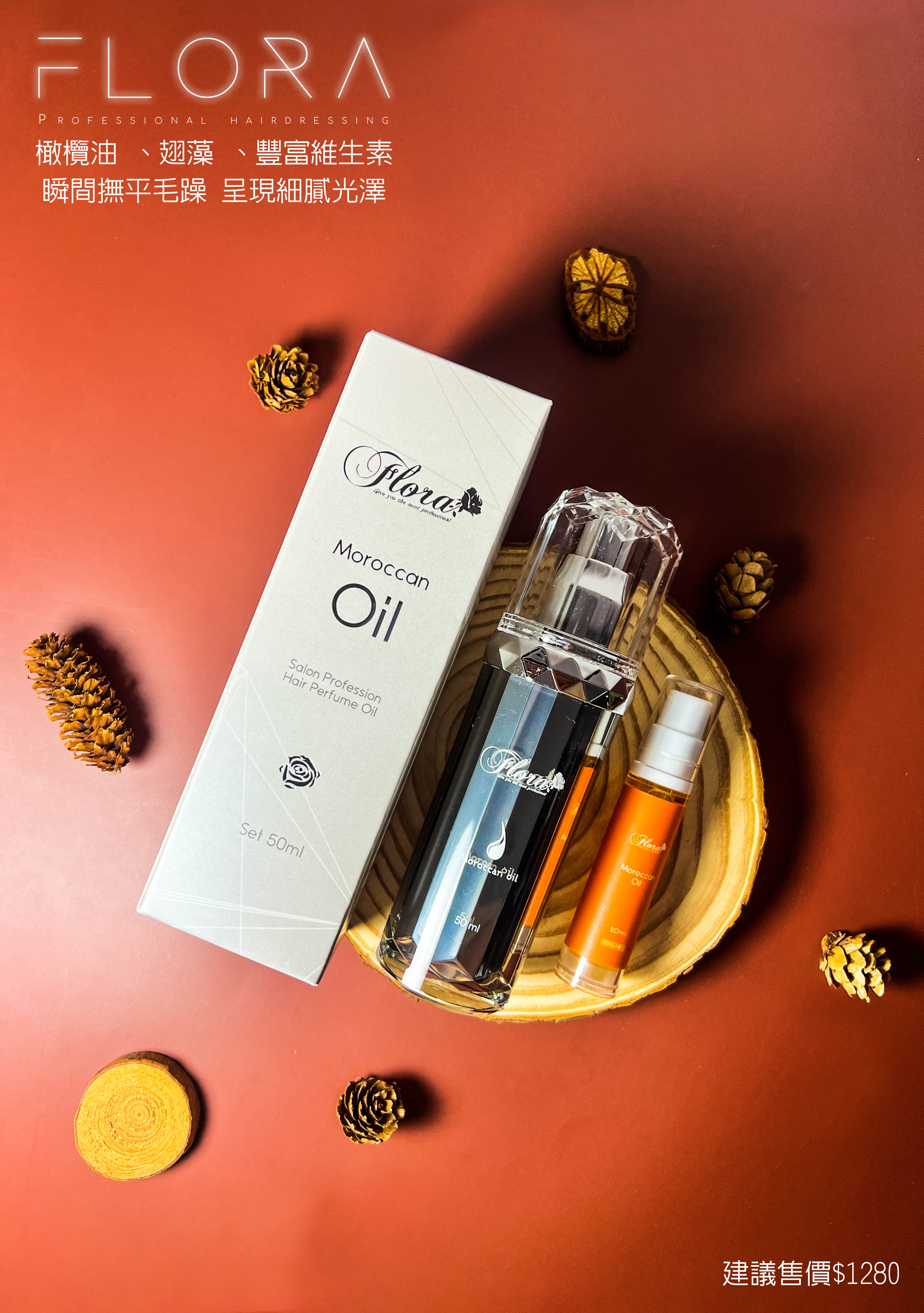【品名】FLORA摩洛哥優油 【容量】50ml 【用途】滋養 修護髮絲 【產品說明】萃取摩洛哥堅果油精華 橄欖油 翅藻 豐富維生素E 瞬間撫平毛躁 呈現細膩光澤 減少斷裂與分岔 【使用說明】適量塗抹洗淨後的秀髮 梳理後即可造型 免沖洗 乾髮使用可增加秀髮光澤級保濕感 ▲設計師愛用推薦